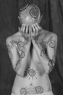 One of my favourite of her work is her 'Chronic Pathway' series, in which Cowley Ford marks the areas of pain and where it travels to and from on her body in intricate henna designs, symbolic of the correlation with the concept of beautiful, ornate imagery and patterns being difficult and painful to experience (for example, doesn't staring at a kaleidoscope for too long make you feel sick?).